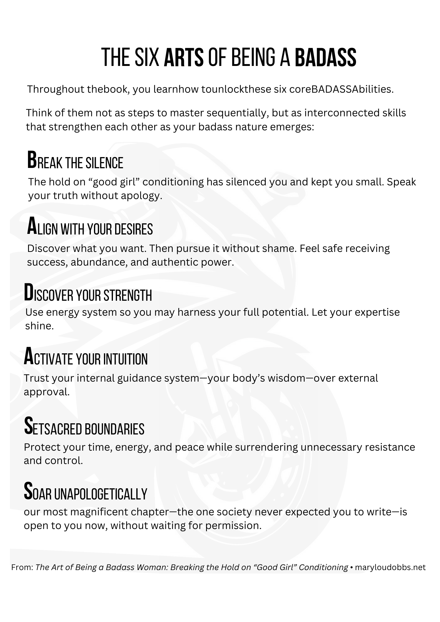 is a transformation coach, motorcyclist, and former corporate executive. After excelling in the insurance industry, she now helps women break free from "good girl" conditioning and embrace an unapologetic pursuit of renewed purpose and adventure. Visit: Maryloudobbs.net