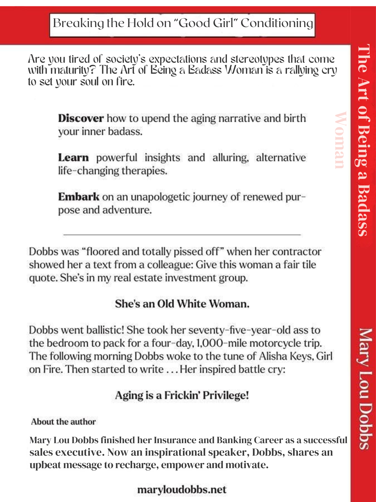 Dobbs was "floored and totally pissed off" when her contractor showed her a text from a colleague: Give this woman a fair quote. She's in my real estate investment group. Dobbs went ballistic! She took her seventy-five-year-old ass to the bedroom to pack for a four-day, 1,000-mile motorcycle trip. The following morning, Dobbs woke to the tune of Alisha Keys, Girl on Fire. Book your appointment with Mary Lou Dobbs today.